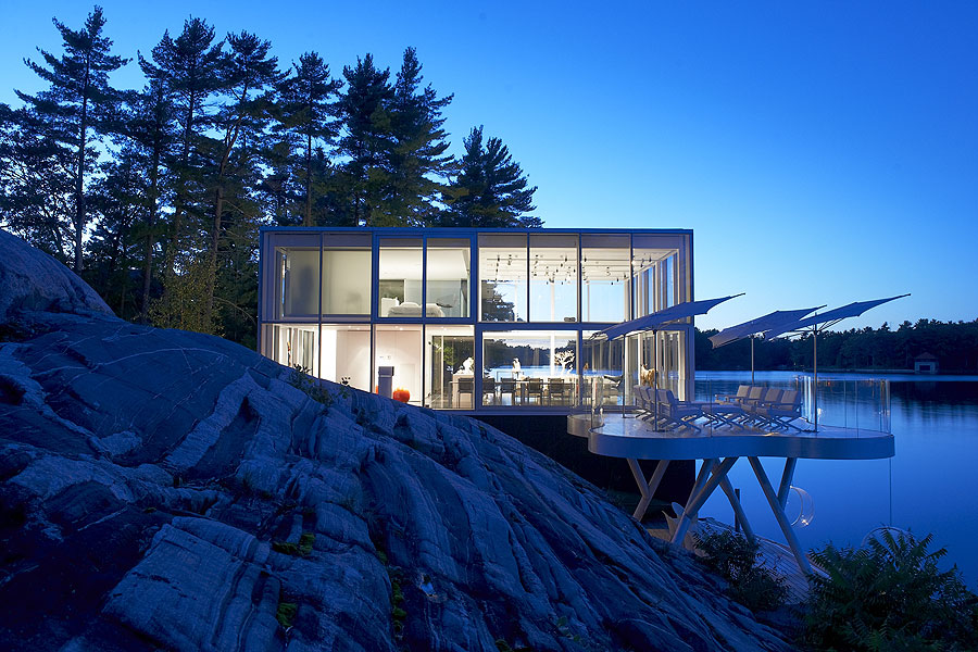 A photographer’s studio over a boathouse on Stoney Lake is inspired by the landscape of the Canadian Shield. Compelling qualities of simple open spaces; interior and exterior unity and sustainability were a driving force for this modern glass box - a refreshing departure from the more traditional stone and wood palette of its neighbours.